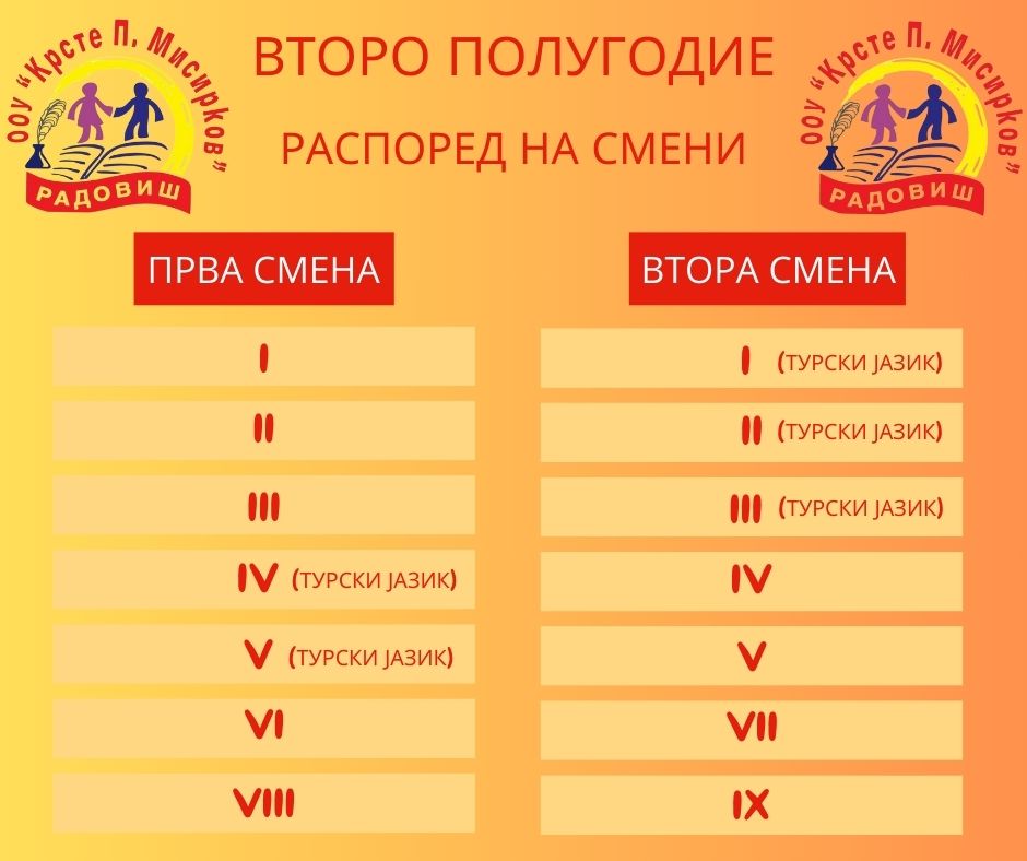 На 20.01.2025 понеделник се враќаме на училиште според следниот распоред на смени: